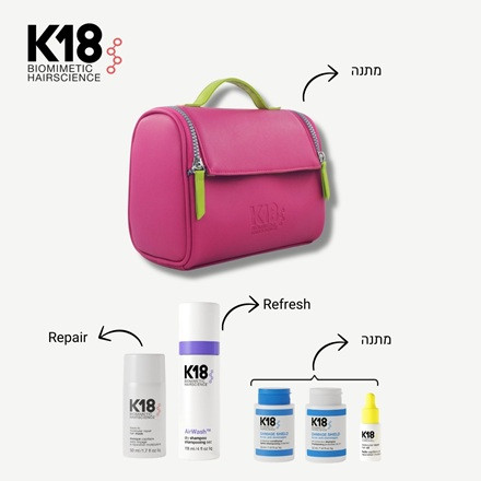 מארז מהודר המשלב את מוצרי הדגל של K18 Biomimetic Hairscience לטיפוח ושיקום השיער,יחד עם מתנות מפנקות.