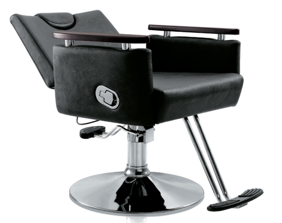כסא ספר מקצועי - כסא מספרה מרהיב בגימור כסף יוקרתי, עם מנגנון הידראולי, ריפוד דמוי עור איכותי בצבע שחור, משענת גב וראש מתכווננות לנוחות מקסימלית.